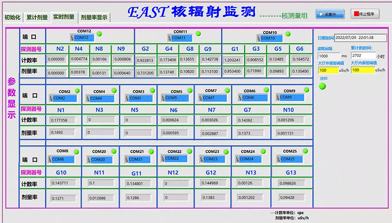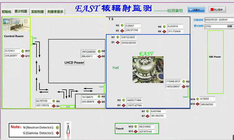 对聚变等离子体放电时实验场所和外围环境的中子、伽马剂量率,以及累积剂量进行24h不间断测量。获得装置脉冲运行和停机期间的剂量率时间演化,进而研究辐射剂量与等离子体放电参数的关系,为人员的辐射防护及环保保护提供基础数据。